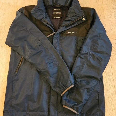 En lilla regnjakke med hætte. Jakken har en lynlås foran og en mørk lomme med knapdetaljer. Der er lyse refleksdetaljer på bagsiden for ekstra synlighed. Jakken har mørke kantdetaljer på ærmer og hætte.