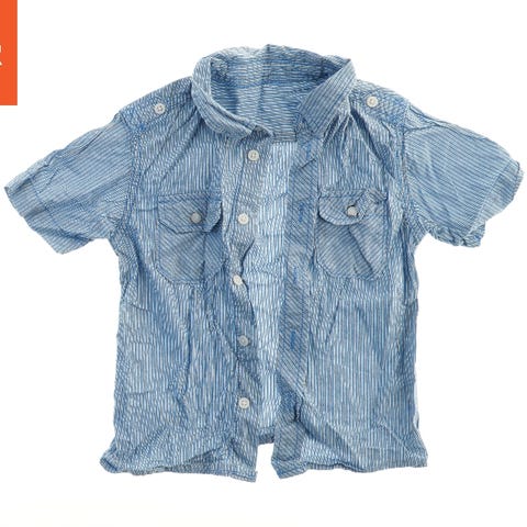Kortærmet skjorte i blå farve med knapper foran og klassisk krave. Materialet ser let og behageligt ud, egnet til varmt vejr. Mærket på indersiden angiver 'Armani Junior' og størrelse 10.