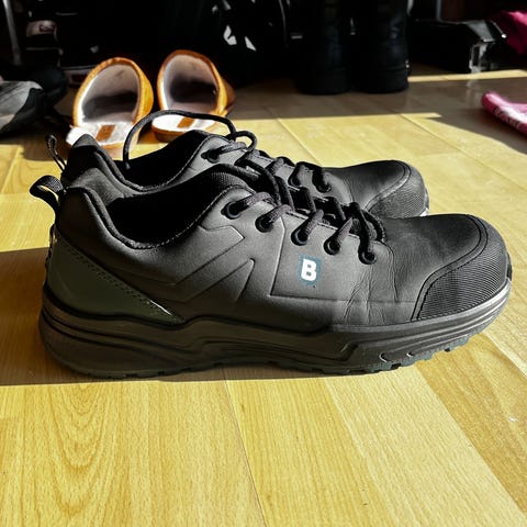 Disse sko er i størrelse 41 og designet til sikkerhed og komfort i arbejds- og industrielle miljøer. De er sorte med blå accenter, inklusive solide såle med kraftigt trækmønster for forbedret greb. Skoene har en snøring foran, der sikrer en fast og justerbar pasform. Skoene er ideelle til arbejdsscenarier, der kræver holdbarhed og beskyttelse.