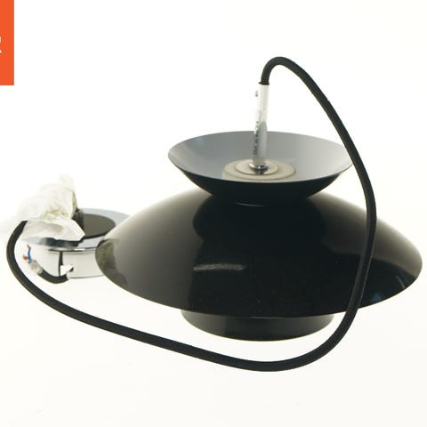 Lampen har en blank finish med en skærm, der udvider sig i en omvendt keglform. Den er udstyret med en ledning til montering i loftet. Lampen tilbyder en stilfuld belysningsløsning til forskellige rum. Tags: pendel, lampe, sort, elektrisk.