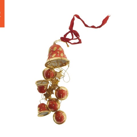 Dekoration af en lille figur med en rød, konisk hat og en hvid kjole med sorte stregdetaljer. Figuren hænger fra et rødt bånd og har lange, tynde ben med sorte sko. Dette dekorative objekt har en størrelse på 22x7 cm og kan bruges som julepynt eller hænges op som en del af indretningen.