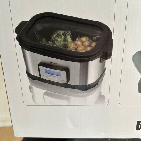 Sous vide maskine i rustfrit stål. Enheden har digitalt display på fronten med knapper til temperatur- og tidsindstilling. Ydersiden er i rustfrit stål med sort plastkant, og låget har gennemsigtigt vindue. Indersiden består af en aftagelig beholder med non-stick belægning, egnet til tilberedning af mad ved præcis, lav temperatur. Velegnet til sous vide-tilberedning i hjemmekøkkenet.