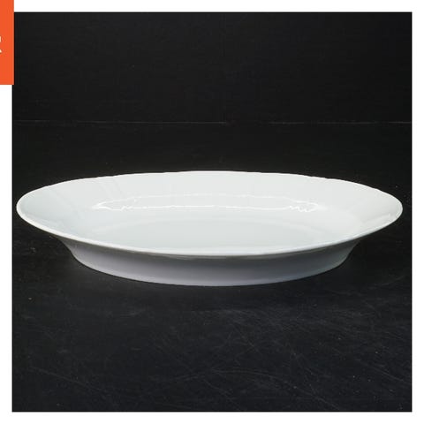 Et elegant, hvidt oval fad fra B & G Løvfald lavet af porcelæn med subtile blademotiv i midten. Fadet har flad bund og jævnt forhøjede sider, ideelt til servering af mad eller som dekoration. Tallerkenen fremstår som stilfuld og tidløs i design. Den har en størrelse på 4x23x15 cm.