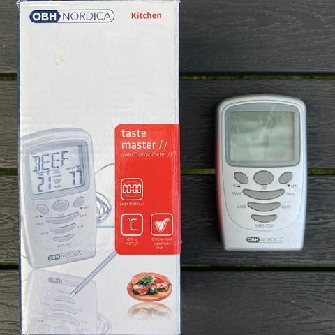 Termometeret fra Oxo kan måle både stegen som bages i ovnen, kyllingebrystet som steges på panden og hamburgeren eller bøffen på grillen.