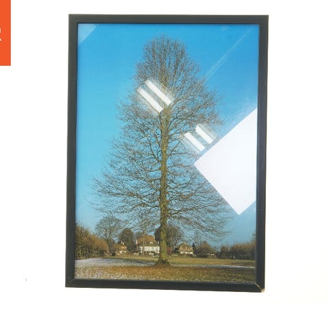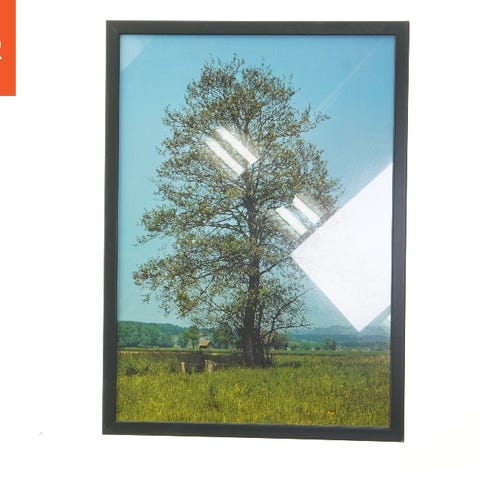 Denne genstand er et billede af et træ, der står på en mark under en klar blå himmel. Billedet er indrammet i en sort ramme. Bagpå ses en opklæbet etiket fra Posterland samt kroge til ophængning. Billedets størrelse er 30x42 cm.