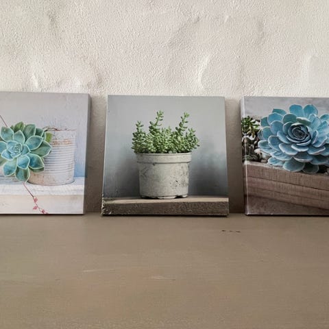Dette er en samling af to små malerier, hver måler 13,5 cm x 13,5 cm. Malerierne er indrammet og viser abstrakte landskaber i blå nuancer med små elementer, muligvis figurer. Bagsiden af rammerne viser kontaktinformation til kunstneren Minannguaq Zeeb. Malerierne kan bruges som dekoration i hjemmet.