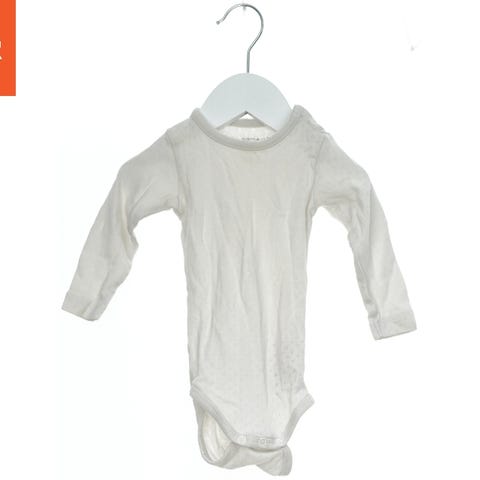 Langærmet hvid bodystocking til baby. Den har en rund hals og trykknapper i bunden for nem påklædning og afklædning. Lavet af et blødt materiale med små, diskrete prikkede mønstre.