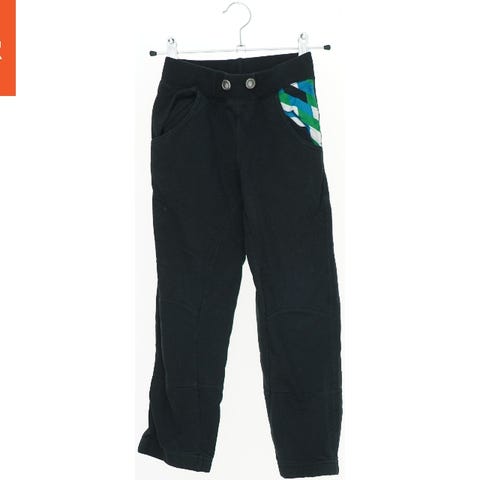 Børnebukser med elastik i taljen og et fugleprint i rosa og brunlige nuancer på en sort baggrund. Der er ribkant ved anklerne.