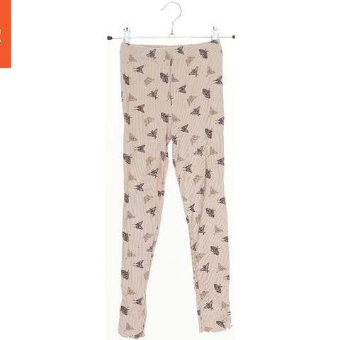 Et par lys rosa leggings dekoreret med et fint fugleprint. De har en elastik i taljen for komfort. Den enkle stil gør dem alsidige til forskellige outfits. Der er ingen mærkbar størrelse angivet på stoffet.
