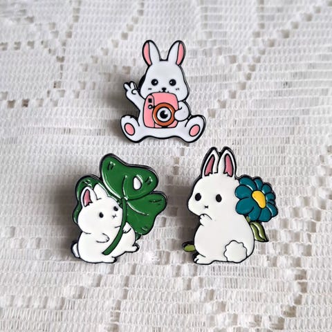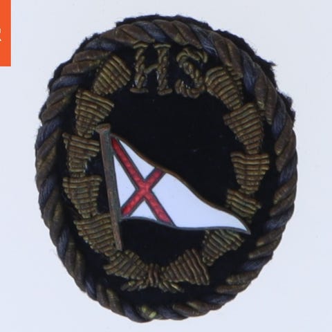 En rund pin med trefork-design. Den er rød med hvide kanter og har en sikkerhedsnål på bagsiden, lavet af metal. Diameteren er 3 cm.