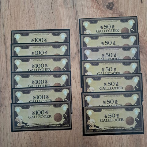 Dette er en kopi af en mønt fra Gringotts Bank. Mønten har en diameter på 4 cm og er udsmykket med unikke motiver på hver side. Den ene side viser et portræt, mens den anden har et dragemotiv. Mønten er lavet af metal og har en gylden farve. Den er en samlergenstand og kan bruges til dekoration eller som del af rollespil relateret til fantasyuniverser.