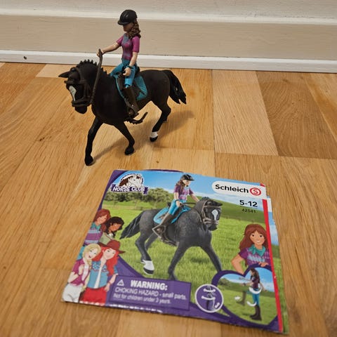 Schleich Horse Club "Mysteriet i skoven" bog. Billedbog/letlæsningsbog på dansk udgivet af Politikens Forlag. Forsiden viser en af pigerne fra Horse Club-universet sammen med en hest. Bagsiden beskriver historien om Lina, Sofia, Hannah og Sarah og deres oplevelser i skoven. Velegnet til børn, der kan lide heste og fortællinger fra Horse Club-serien.