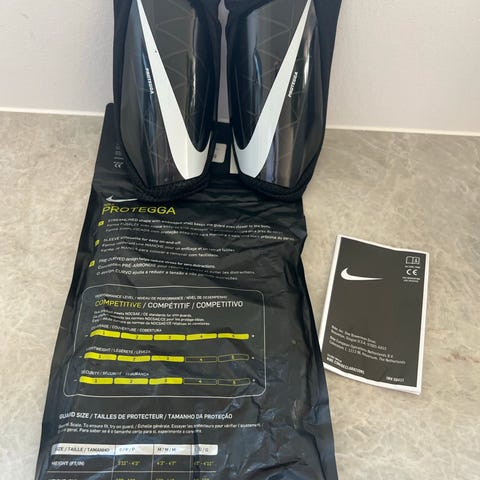 Nike benskinner i blå med integreret grå strømpe. Benskinnerne har hård yderskal og blød polstring indvendigt. Til fodbold og andre sportsgrene, hvor der er behov for beskyttelse af skinnebenene. CE-mærket. Egnet til større børn. Kan ses an på Østerbro i København.