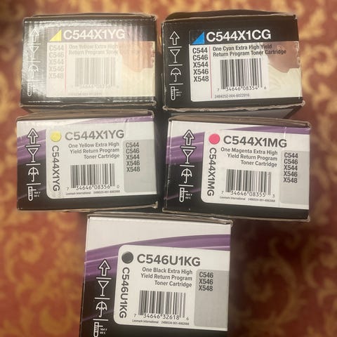 Toner cartridge til printer, modeller LEXC702HC (cyan) og LEXC702HY (gul). Ikke-OEM produkter, leveres i hver sin æske som vist på billederne. Velegnet som erstatningstoner til kompatible printere, hvor disse modelnumre anvendes.