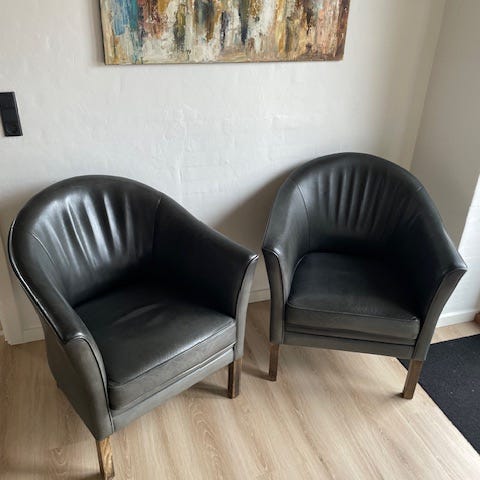 'Dronningestol', lænestol betrukket med patineret cognacfarvet læder.