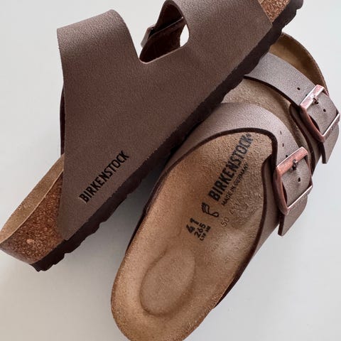 Birkenstock i modellen Arizona. Sandalerne er i blå ruskind med metalspænder og hvid sål.