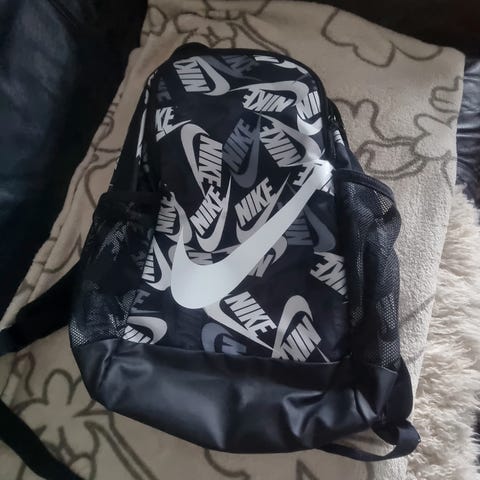 Sort Nike rygsæk med et stort hovedrum, lynlåslomme foran og sidelomme i net.