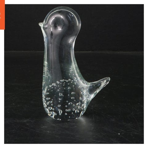 Fugl i ravfarvet krystalglas. Svensk glaskunst fra FM Ronneby. H9 cm. Du kan loppesjoppe den for 90 kr.