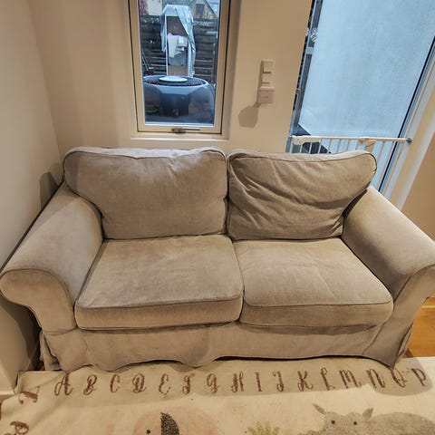 Grøn 2 personers sofa. Kan lænes tilbage hver for sig, som lænestol.