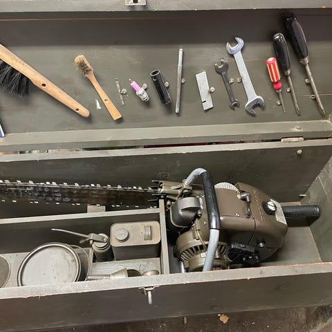 Her sælges en utrolig velholdt Jonsereds Raket XG motorsav fra 1960'erne. Saven leveres i den originale, orange militær/skovbrugs-transportkasse ("Motorhandsåg Enmans").