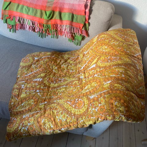Anna Banana vintage tæppe med blomstermønster i flere farver. Tæppet har et tæt, allover blomster- og paisleymønster i blandt andet gul, rosa og grålige nuancer. Egnet som sengetæppe, plaid eller dekorativt tæppe i stue eller soveværelse.kapokfyld.