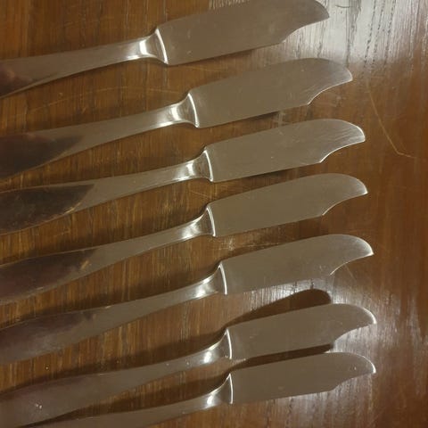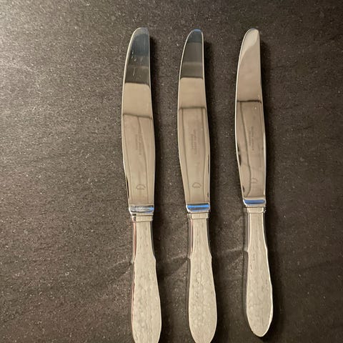 Georg Jensen Bernadotte fiskeknive l blankt stål. 2 stk. i æske. Har aldrig været brugt. Fejler intet.