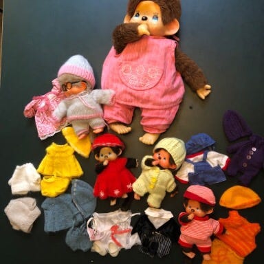 To Monchhichi figurer. Den ene figur sidder på et fly, og den anden har en lyserød bluse på og holder stjerner og en klokke.