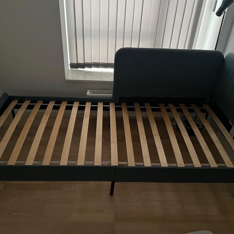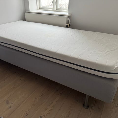 IKEA enkeltseng med madras i sort og hvid. Sengen består af en træramme med lameller og en polstret madras øverst. Undersiden er beklædt med sort stof, mens liggefladen er lys. Velegnet som enkeltseng i soveværelse, gæsteværelse eller som ekstra seng. Eventuelle brugsspor og mindre skader fremgår af billederne.