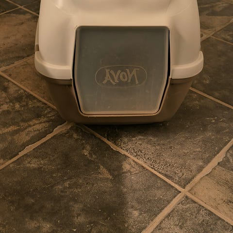 Klassisk kattetoilet med transparent svingdør, praktisk bærehåndtag og filter med aktivt kul.
