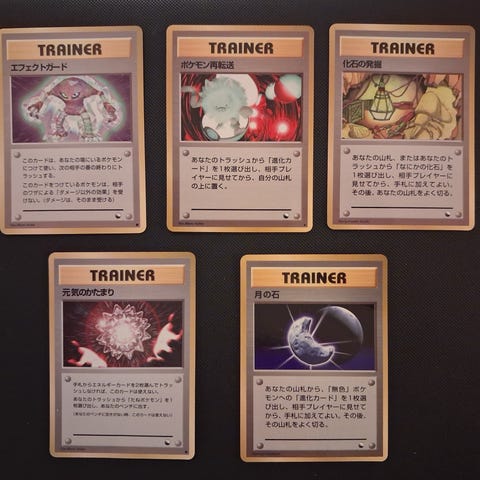 Sælger her 5 originale japanske Pokémon Trainer-kort fra 1996 (Base Set). Kortene er i fantastisk stand (Near Mint/Excellent) med minimale brugstegn på bagsiden. Perfekt til samleren, der elsker det klassiske "Old Back" design.