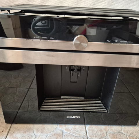 Siemens indbygget espressomaskine i sort glasfront til montering i højskab. Maskinen har udtrækkelig kaffeenhed og drypbakke samt betjeningsknap på fronten. Velegnet til fast installation i køkken, hvor der ønskes integreret kaffeløsning.
