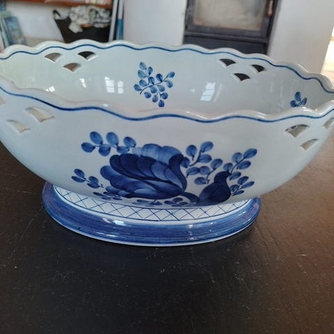 Oval skål i fajance på fod med gennembrudt kant.