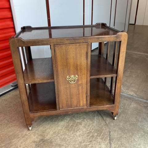 Rullebord i metal med flere åbne hylder og lukket bagside. Bordet står på hjul, så det er let at flytte rundt. Velegnet til opbevaring og organisering i f.eks. stue, kontor eller køkken, hvor der er behov for mobil opbevaring.