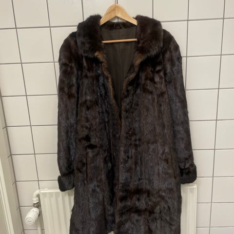 Stand: Brugt med brugsspor. Der er enkelte små huller ved kraven på indersiden af foret – disse er ikke synlige, når frakken bæres. Selve pelsen er velholdt, blød og har stadig flot glans.