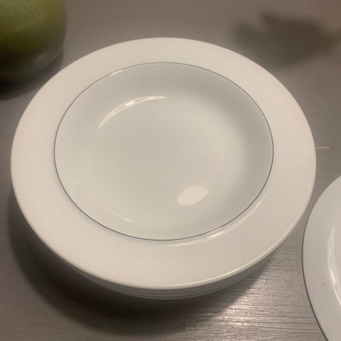 Royal Copenhagen fajance dybe tallerkener i hvid med enkel markeret kant. Blåkant Tallerkenerne er velegnede til servering af fx suppe, pasta eller gryderetter. Undersiden er stemplet med Royal Copenhagen-mærke og fajancebetegnelse samt modelnummer 3072