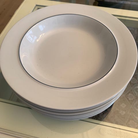 Royal Copenhagen tallerken i hvid fajance med enkel mørk kantdekoration. Blåkant Tallerkenen egner sig til daglig brug eller som del af et stel til servering af måltider. Klassisk rund form med glat overflade.