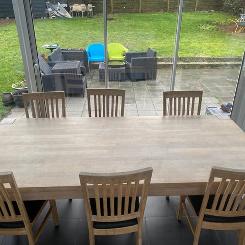 Gammelt Spisebord med stole. Tydelige brugsspor. Men hvis man har lyst et renoveringsprojekt, kan det blive en virkelig flot og elegant spisestue. Stolene er stabile og skal blot males og have nyt betræk