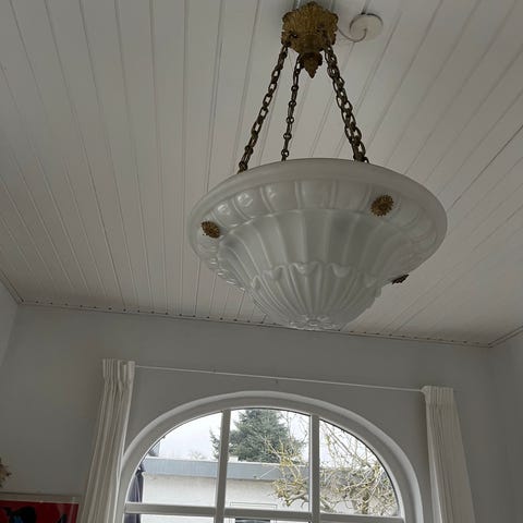 Antik loftlampe med hvidt glas og detaljer i bronze. Lampen har en dekorativ kædeophængning og et klassisk design. Velegnet til brug i ældre eller vintage-indrettede rum.