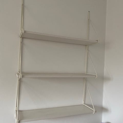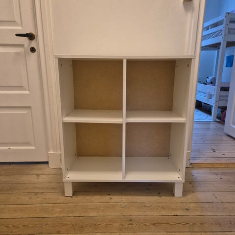 Lille hvid reol på ben. Reolen kan skrues fast i væggen, så den ikke vælter.