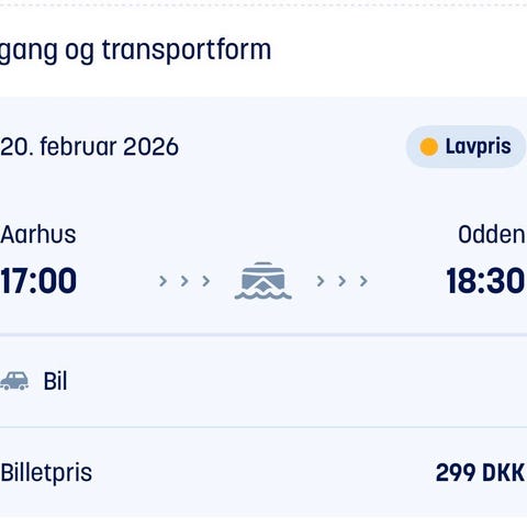 Billet til færgeoverfart: Aarhus-Odden 13.02.2026, kl. 10.30. Antal og nummerplade kan ændres.