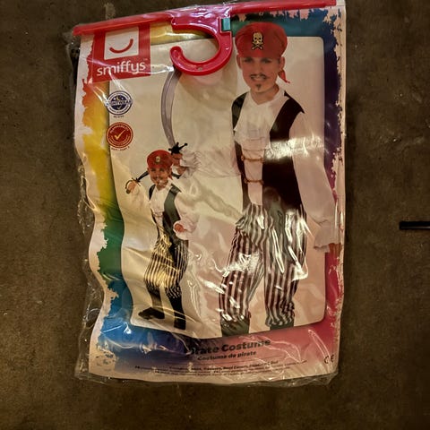 Pirat kostume: 2 par bukser (den sorte er i str 128, de stribende er i str 116) sammen med en bluse, en krog og en tørklæde