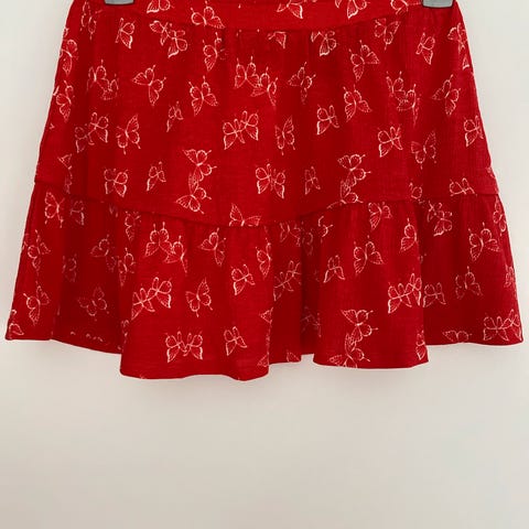 H&M nederdel til kvinder i str. L. Nederdelen er i rød ternet polyester med sort for. Modellen er kort med læg og lynlås bagpå. Egnet som hverdags- eller fritidsnederdel.