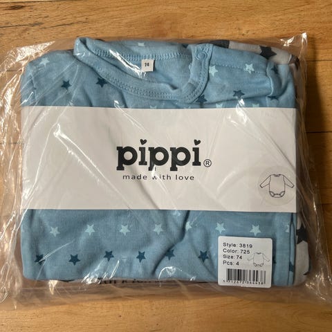 Hvid body med sorte stjerner fra Pippi. Str. 56, men lille i størrelsen, så jeg vil sige at den passer str. 50.