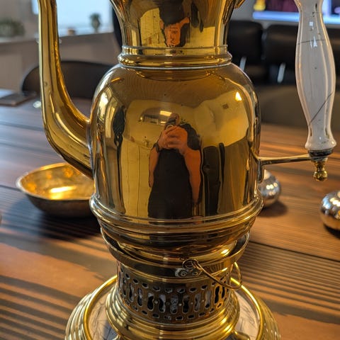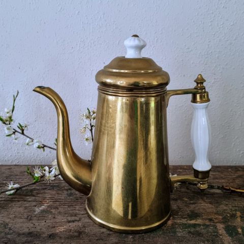 Smuk antik messing kaffekande med varme stativ, Messing antik, 150 år gl.