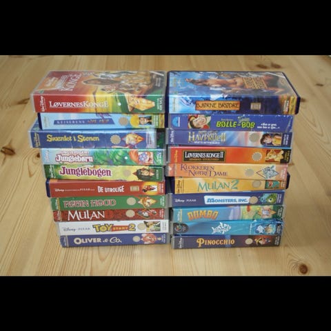 Disney samling VHS film med forskellige klassiske tegnefilm. Blandede titler i originale kassetter, egnet til samlere eller til afspilning på VHS-afspiller. Flere kendte Disney-tegnefilm i dansk udgave kan indgå i samlingen, som eksempelvis eventyr- og familiefilm til børn og voksne. Antallet af film svarer til det, der ses på billederne. Prisen er for alle.