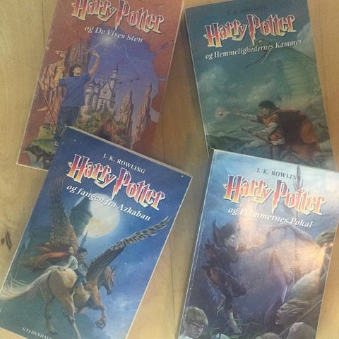 Bøgerne er i hardback-udgave på dansk og følger Harry Potters første fire skoleår på troldmandsskolen Hogwarts. Samlet pris.