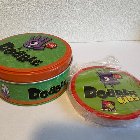 Dobble Kids kortspil. Spillet består af runde kort med illustrationer, hvor spillerne skal finde ens symboler mellem kortene. Velegnet som familiespil og til børn, der øver observation og reaktionsevne.