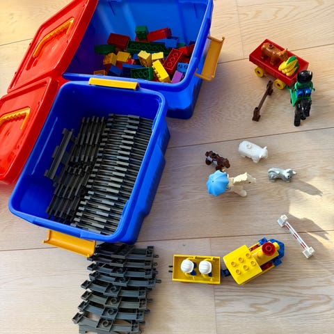 LEGO DUPLO klodser forskellige blandede sæt. Inkluderer blandt andet to batteridrevne togbaner - et damptog og et fragttog, masser af skinner, forskellige DUPLO klodser og elementer i flere farver og størrelser, en stor byggeplade og mange køretøjer, figurer og dyr.
