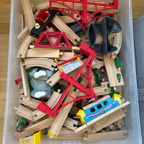 BRIO trætog skinner og tilbehør. Sættet består af forskellige lige, buede og specialformede træsksinner samt enkelte tilbehørsdele som for eksempel broer eller bygningselementer. Nogle er nye og andre er af ældre dato. Der er nok til at bygge den helt store togbane,