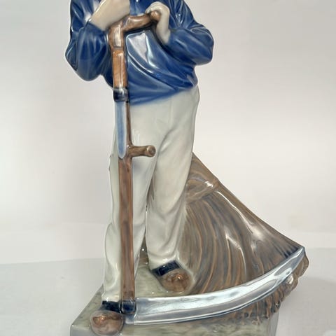 Royal Copenhagen porcelænsfigur af landmand med le. Figuren forestiller en mand i hat, blå skjorte og lyse bukser, stående ved en le foran et neg korn. Figuren står på rektangulær fod. Undersiden er mærket med Royal Copenhagen. Fremstår uden skår eller ridser. Kommer fra ikkeryger hjem.